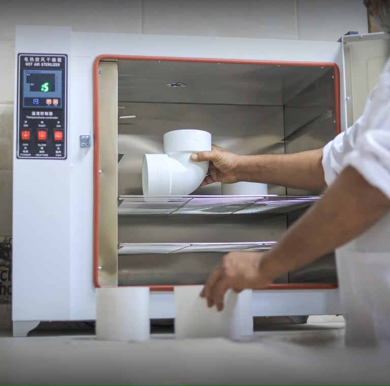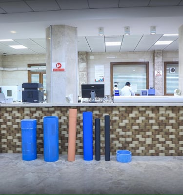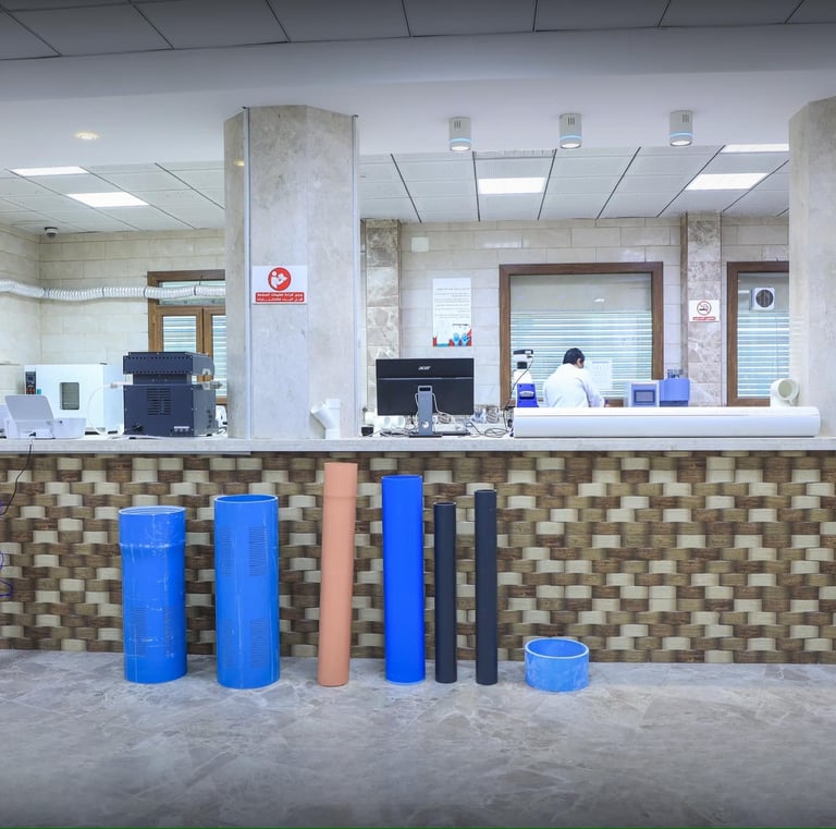 اختبارات المنتج النهائي: الضغط الهيدروستاتيكي وضغط الانفجار، اختبار الصدمة (السقوط الحر والبندول)، اختبارات الشد والصلابة، اختبارات التدوير الحراري ومقاومة المواد الكيميائية، اختبارات الأبعاد (السمك، الطول، القطر) بأجهزة قياس دقيقة.
